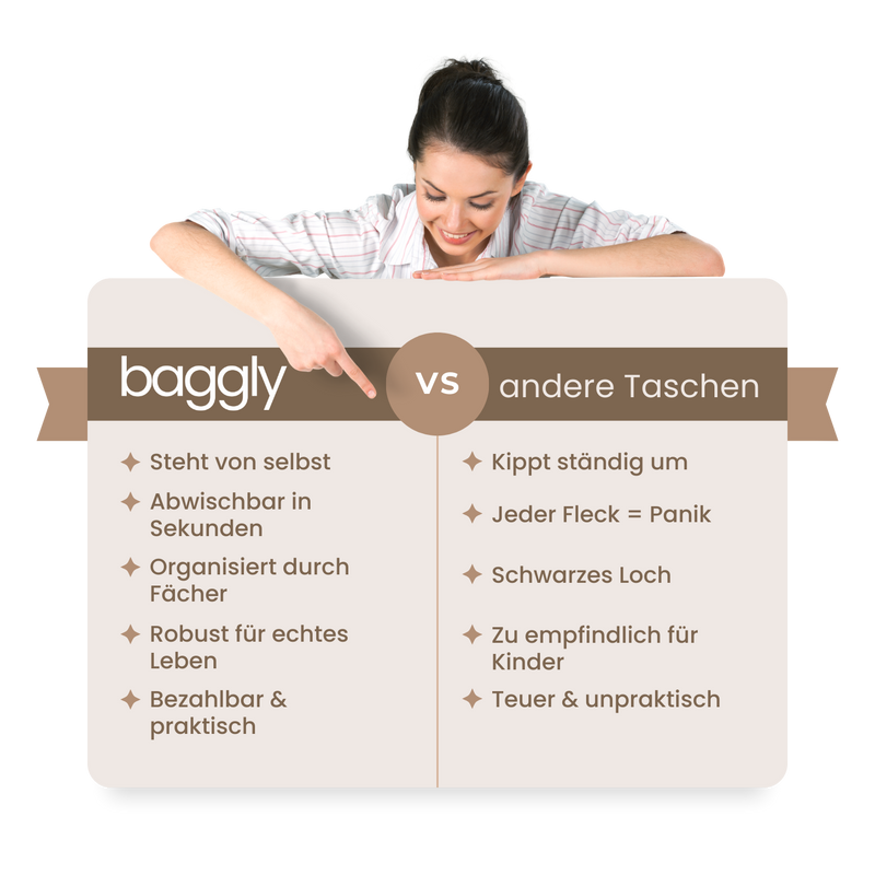 Baggly ist anders: Abwischbar, organisiert, robust. Gemacht für echtes Leben, nicht nur fürs Instagram-Foto.